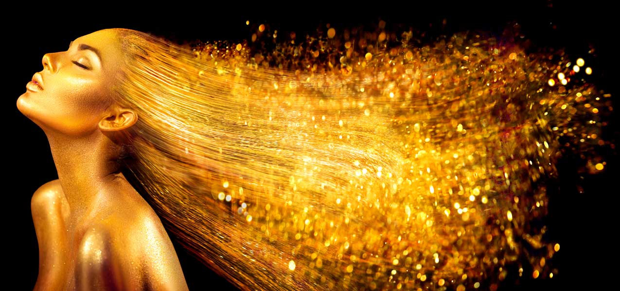 زن طلایی با موهای درخشان یک تابلو دیواری با تصویر یک مدل زن با پوست طلایی و موی نورانی، ترکیبی منحصر به فرد از هنر دیجیتال و طراحی مدرن را ارائه میدهد.