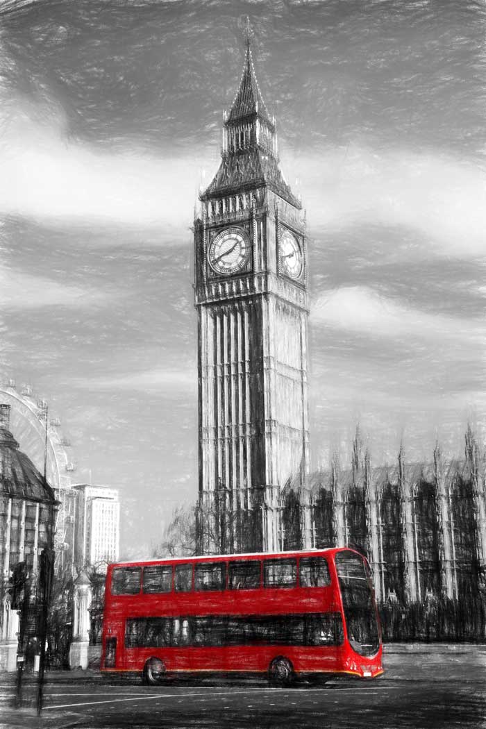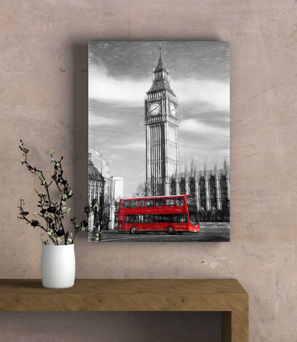 طرحی هنری از برج را با یک اتوبوس قرمز نمادین در پیش‌زمینه ارائه می‌دهد. ترکیب رنگ‌های خاکستری با پاشش‌های نقاشی‌مانند حسِ نئونی-کلاسیک را ایجاد می‌کند که به فضای داخلی شما عمق و شخصیت می‌بخشد.