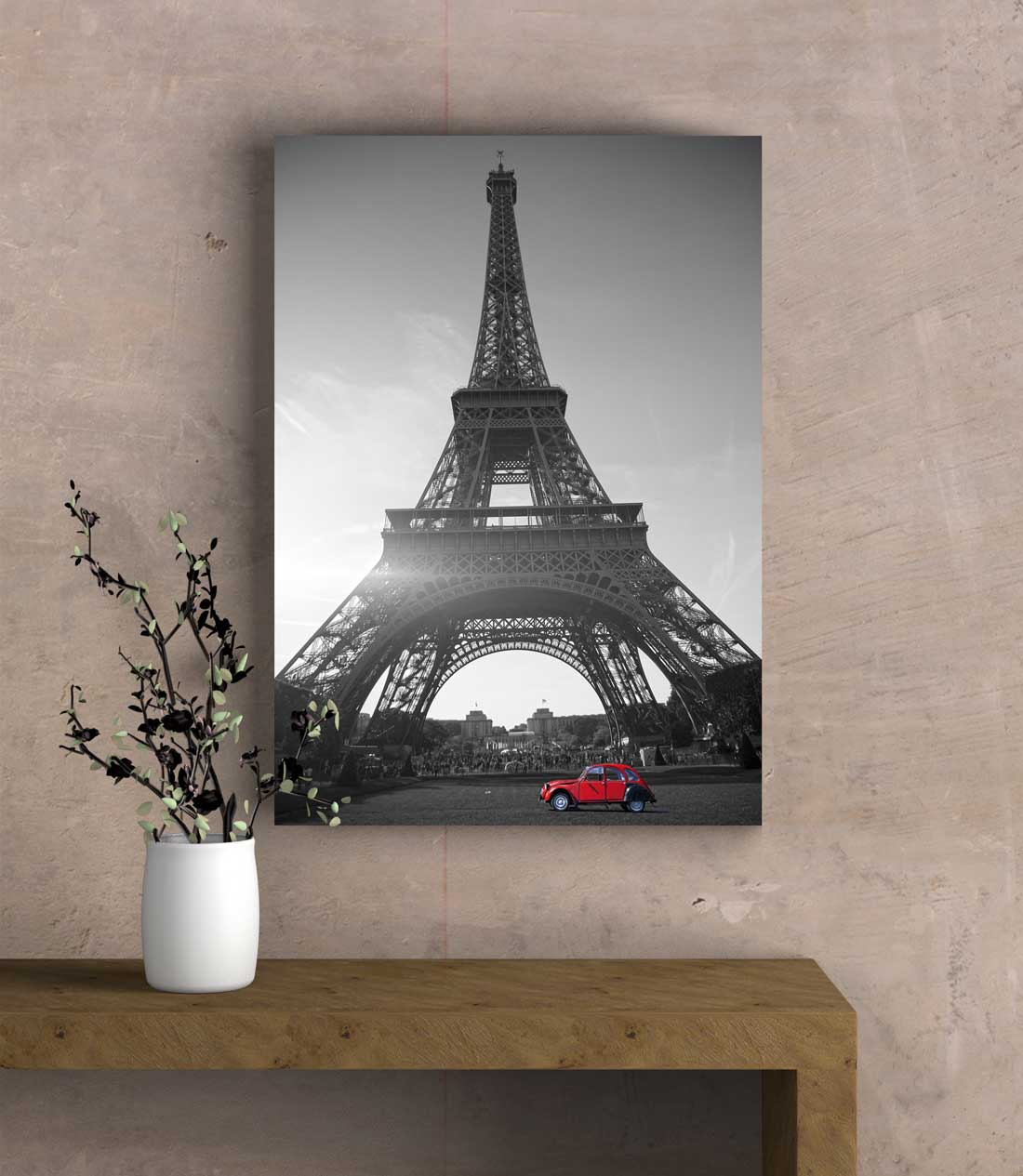 تابلو کلاسیک برج ایفل یک تابلو دکوراتیو با طراحی بینظیر که با یک خودرو کلاسیک قرمز در پایه ترکیب میکند.